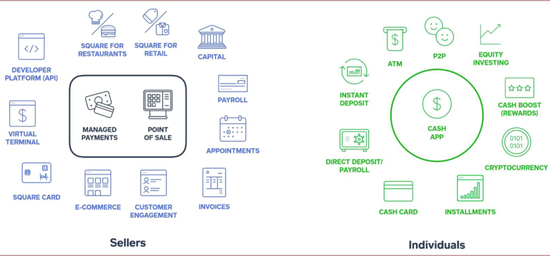 Square提供的金融服务包括实体卡(Square Card、Cash Card)、转账增值服务(Instant Deposit、Direct Deposit)、Cash App中的投资功能(比特币、股票)以及贷款服务(Square Capital、Square Installment)。