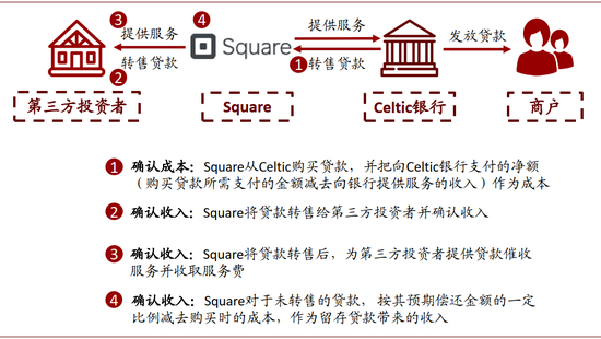 ► 在贷款服务方面,Square基于大数据风控向中小商户提供企业贷款以及向消费者提供分期付款。前者由Square直接提供给商户,后者则由Square支持商户在收款页面向消费者提供该支付选项,销售完成后Square向商户支付全部款项,并向消费者收取分期支付的本金和费用。二者均受到FDIC监管,由Square的合作方Celtic银行(犹他州的产业银行)首先发放贷款。在此过程中Square作为第三方供应商提供数据和技术支持,Celtic银行作为贷款方提供放贷资金;银行放贷后,Square从Celtic银行购买贷款(Square将购买贷款额减去从银行收取的服务费的净额作为成本);最后,对于企业贷款,Square把大部分卖给第三方投资者(此时Square确认收入),收取贷款额度一定比例的前端费用(upfront fee),并将小部分贷款留在Square资产负债表内用于风控测试以及与投资者共同承担风险。Square把贷款转售后继续帮助第三方投资者收回剩余贷款,同时收取管理费(此时Square确认收入)。由于消费者分期付款不属于贷款服务的核心组成部分,Square未披露此类贷款具体的转售操作。
