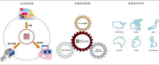 在完善业务框架、增长用户规模的基础上,Square于2017年四季度明确了三大战略:全渠道商务(omnichannel commerce)、拓展金融服务范围、发展已有布局的国际市场: