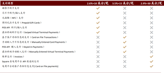 资料来源:公司官网,中金公司研究部;注:表中为标准化价格,大商户需要联系Square销售获得定制化价格。