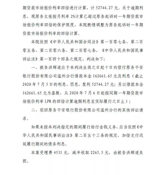 一、被告洪辉道应于本判决生效之日起十日内偿付原告平安银行股份有限公司温州分行借款本金162661.65 元及利息(截止2020 年7 月5 日的利息、罚息、复利52744.27 元;另以借款本金162661.65 元为基数,从2020 年7 月6 日起按同期一年期贷款市场报价利率LPR 的四倍计算逾期利息至实际履行之日止);