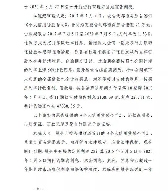 若借款人任何一期未及时足额归还借款本息即视为逾期,原告有权要求提前归还已发放的全部贷款本金并结清利息,自逾期之日起,对逾期金额按照本合同约定的利率上浮50%计收罚息,因此被宣告提前到期的,对本合同项下未归还的全部借款本金计收罚息,对不能按时支付的利息,按罚息利率计收复利。借款后,被告洪辉道足额支付至第10 期即2018年5 月4 日,第11 期仅支付期内利息2138.39 元、复利227.11 元,共计已偿还本金47338.35 元。