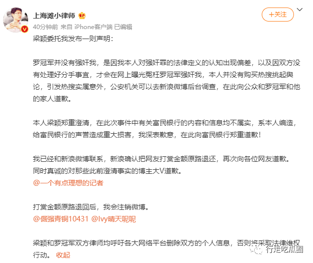 罗冠军并没有强奸我,是因我本人对强奸罪的法律定义的认知出现偏差,以及因双方没有处理好分手事宜,才会在网上曝光冤枉罗冠军强奸我,本人并没有购买热搜挑起舆论,引发热搜实属意外,公安机关可以去新浪微博后台调查,在此向公众和罗冠军和他的家人道歉。