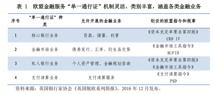 欧盟“单一通行证”展现出灵活性和实操性强的特点。欧盟“单一通行证”非常灵活,有多种类型,由对应的欧盟指令创设,分别涵盖储贷、金融市场、资产管理、支付清算、电子银行等业务(见表1)。在具体应用中,可以“成熟一项、推出一项”,可操作性强。