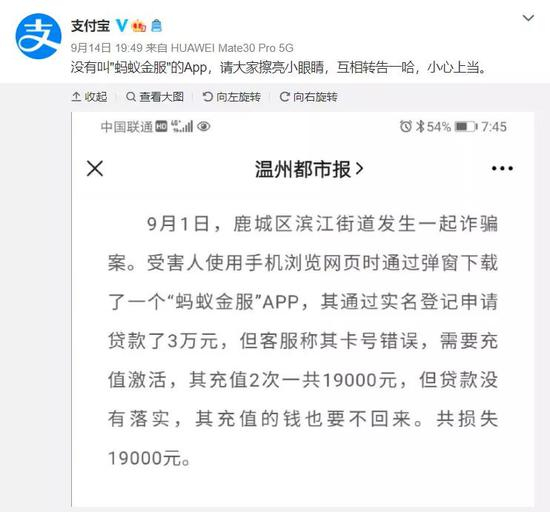 支付宝方面发布图片显示,9月1日,鹿城区滨江街道发生一起诈骗案。受害人使用手机浏览网页时通过弹窗下载了一个“蚂蚁金服”APP,其通过实名登记申请贷款了3万元,但客服称其卡号错误,需要充值激活,其充值2次一共19000元,但贷款没有落实,其充值的钱也要不回来。共损失19000元。