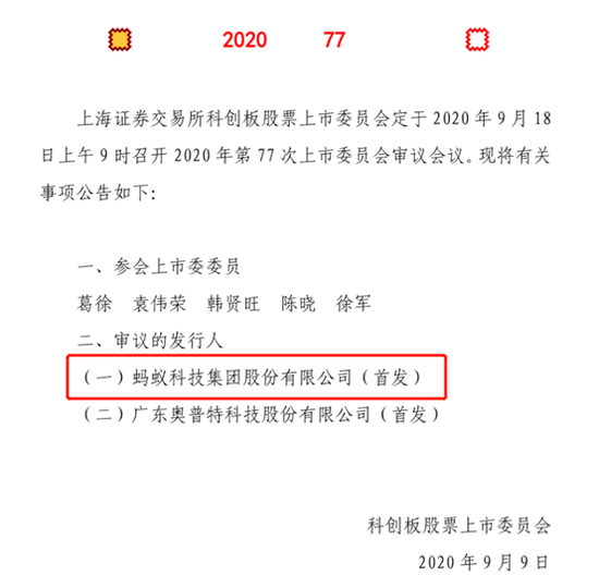 9月9日,科创板上市委在网站公告,将于9月18日上午9时召开2020年第77次上市委审议会议,蚂蚁科技集团股份有限公司首发上会。