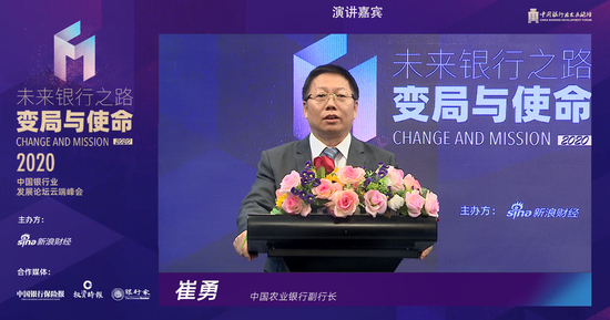 9月23日消息,由新浪财经主办的“2020中国银行业发展论坛”今日正式启幕,本次论坛主题为“未来银行之路:变局与使命”,中国农业银行副行长崔勇出席活动并致辞。