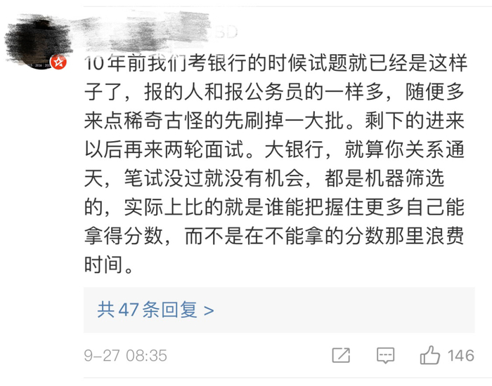 一位10年前参加过银行笔试的网友坦言,“10年前的试题就已经是这样子了……实际上比的就是谁能把握住更多自己能拿的分数。”