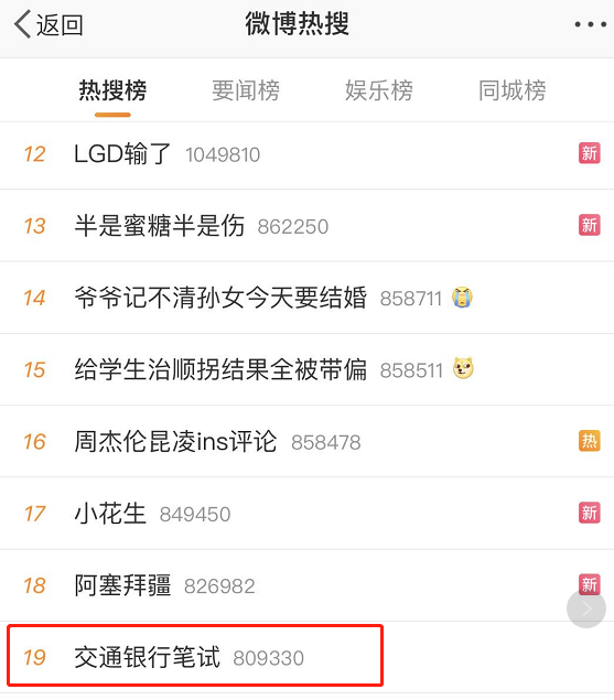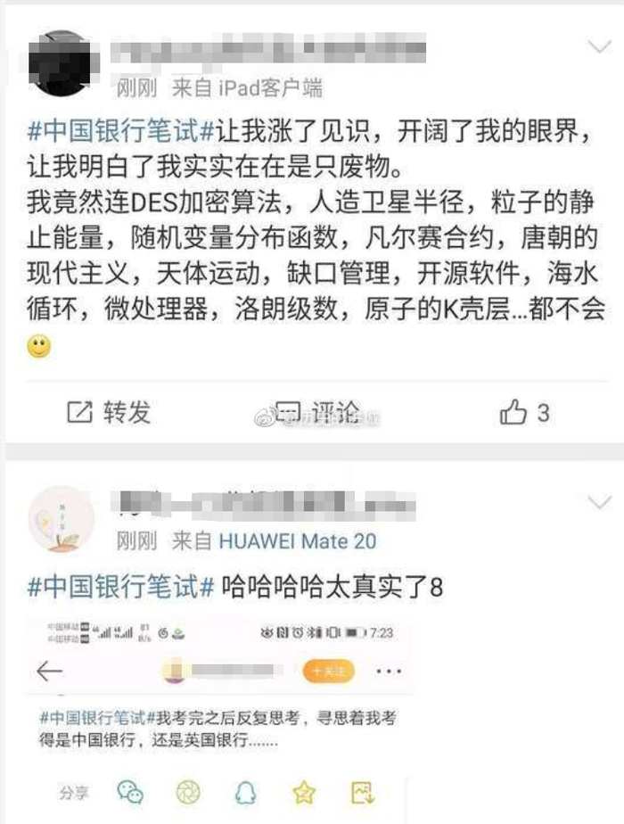 中国银行因其高难度的笔试题登上微博热搜,而交行方面,则是因系统出现崩溃,出现无法提交试卷的情况。