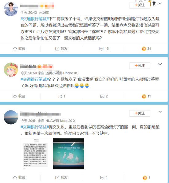 继中国银行因校招笔试题目难度登上热搜后,交通银行再次“中枪”。不少参加笔试的考生在微博发文称,在考试过程中,因系统出现崩溃,出现无法提交试卷的情况。