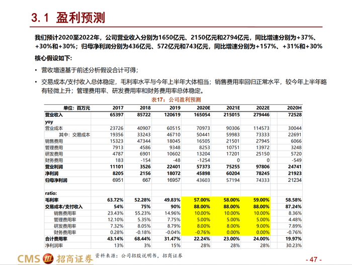 A)对公司2020-22年的收入预测为:1711亿/2287亿/2977亿,盈利预测为401亿/486亿/612亿;