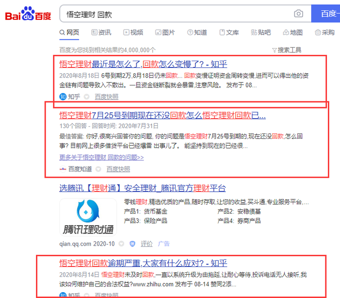 百度上,搜索“悟空理财 回款”网页前几条都是在询问悟空理财最近回款变慢原因的问题。