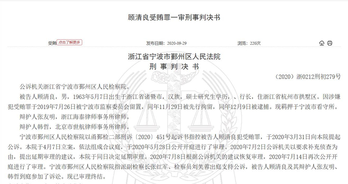 判决书显示,顾清良因涉嫌犯受贿罪于2019年7月26日被宁波市监察委员会留置,同年11月29日被先行拘留,同年12月9日被逮捕。