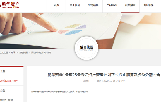对于王女士谈到的鹏华聚鑫资管产品兑付逾期问题,《红周刊》记者从鹏华资产管网查获的信息显示,鹏华资产已于10月15日发布了鹏华聚鑫1号至25号专项资产管理计划正式终止清算及权益分配公告。