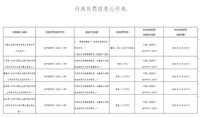 一、央行公示信息显示,中国农业银行股份有限公司吉林市江北支行存在的违法行为类型有:1、侵害消费者个人信息依法得到保护的权利;2、违反反洗钱管理规定,泄露客户信息。央行对其给予警告,并处1223万元罚款。该支行时任行长、副行长、营业室业务主管和员工,分别被罚1.75万元至3万元不等。