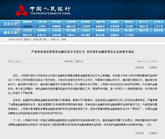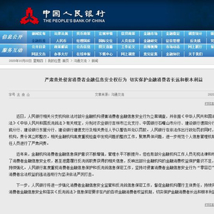 中国人民银行有关部门负责人表示,人民银行一直高度重视消费者金融信息保护工作,坚持对侵害消费者金融信息安全行为“零容忍”,对侵犯金融消费者合法权益的违法违规行为坚决依法严厉打击。
