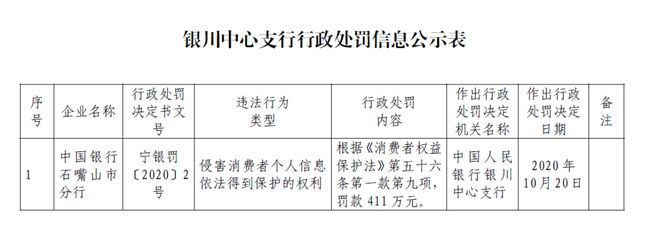 二、中国银行石嘴山市分行存在侵害消费者个人信息依法得到保护的权利的违法行为,被罚411万元。