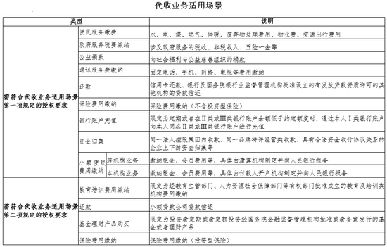 (一)对于付款人与收款人、付款人与付款人开户机构、收款人与代收机构分别签订代收服务协议的,付款人开户机构可以支持付款人(代收机构可以根据收款人委托)通过代收业务办理便民服务、政府服务、通讯服务、非投资型保险等相关费用缴纳,公益捐款,信用卡还款、银行及国务院银行业监督管理机构批准设立的有发放贷款资质许可的其他机构的贷款偿还,银行账户充值,资金归集,以及缴纳租金、会员费用等小额便民业务。具体代收业务适用场景详见附件。