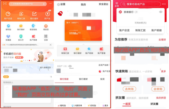 浙商银行APP(简约版)去掉了理财、生活频道,重构了“首页”和“我的”频道架构, “卡片”形式的账户查询更清晰合理,高频操作点更易触达,一定程度上减少了新用户/老年用户的学习成本。但无论是简约版还是复杂版,无论是区块链技术还是大数据应用,最终目的还是要优化每一个用户旅程、完善每一个功能点。
