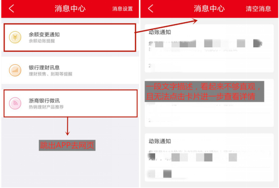 消息互动方面,浙商银行APP“消息中心”整合了余额变更通知、银行理财讯息和浙商银行微讯(查看要跳出APP),可以进行动账、理财和信用卡消息的“开启/关闭”,也可以清空消息。用户每一笔交易,APP会进行弹窗提示,美中不足的是,无法进一步查看详情。此外,APP设有金融日历,可以自动提醒待办金融事项。