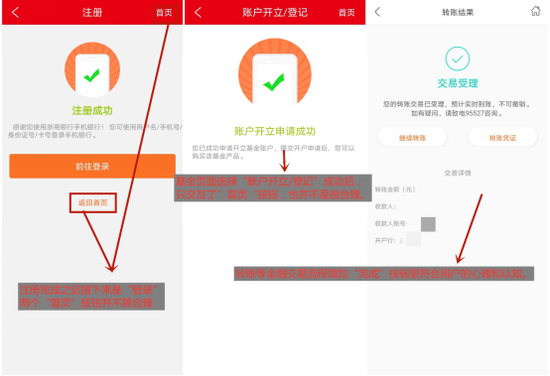 常用操作方面,浙商银行APP用户可以快速找到账户查询、转账汇款、扫码支付等功能入口。常用操作之间进行了交互,但交互水平仍有提升空间:第一,部分交互略显重复且繁杂;第二,部分交互不够合理,比如用户开了基金账户之后跳回首页,不如跳到基金页合理,转账等金融交易旅程结束增加“完成”按钮更符合用户心理和认知。对于用户的常用金融旅程,如何进行克制的合理交互,值得每一家银行APP思索。