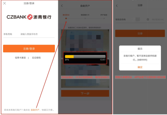 浙商银行APP本行用户自助注册流程比较清晰,手机接收验证码、设置登录密码,进行校验后即可完成注册。但APP不支持非本行用户注册,非本行用户需先“自助开户”再注册。其中,自助开户有相关提示,也支持OCR识别身份证和银行卡信息,但识别效率比较低。与同业相比,浙商银行APP还未实现注册与绑卡的分离。