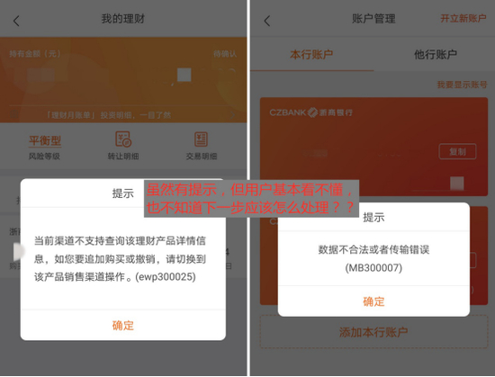 若用户旅程受阻,浙商银行APP给出了相关提示和错误代码,但进一步的有效引导仍有较大提升空间。此外,部分机型在测试中出现卡顿、闪退。