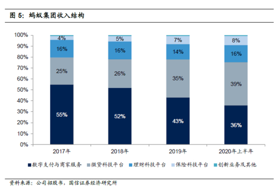 蚂蚁招股书显示,集团的主要收入来自四个板块,分别是数字支付与商家服务、微贷科技平台、理财科技平台和保险科技平台。而下图可以直观看出,支付板块所占比重有所降低,微贷、理财和保险三大板块所占比重在持续上升。