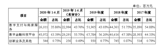 其中,今年上半年数字金融科技服务业务收入为459.72亿元,占蚂蚁的总收入比重超过六成,较去年同期增加7.2个百分点。从2019年起,数字金融业务超过支付业务,已成为贡献营收最多的业务板块。蚂蚁集团在招股书中直言:数字金融科技平台收入的增长“预计将成为公司未来增长的重要驱动因素”。