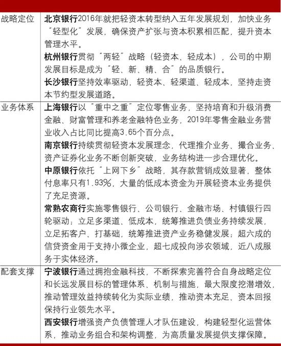 做好配套支撑。轻资本转型不单是业务结构的调整,必须由低成本资金、金融科技、风控能力、人力资源等提供配套支撑。部分中小银行坚持改造自身,实行组织变革,强化要素整合,不断健全轻盈高效的专业服务体系,聚焦“轻业务”“轻管理”“轻运营”,资本内生能力持续增强;以金融科技助推轻资本转型,以金融科技重构传统业务,推进数字化改造,强化内外部的科技赋能,推动业务向精细化、场景化、数据化、标准化和体系化发展;不断创新产品,驱动以客户为中心的业务模式变革,实现简单、快捷的产品体验;深耕本土,推进服务下沉,提升创新能力,为客户提供全方位、一站式的综合金融解决方案;科技引领,打造科技型金融企业。