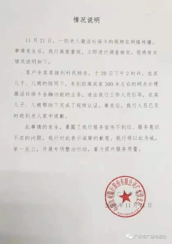 之后,农行广水市支行发布情况说明中表示,客户余某某接到村民转告,于20日下午2时许,在其儿子、儿媳的陪同下,来到距离其家300米左右的网点办理社保卡金融功能的业务,遂由该行工作人员引导,在其儿子、儿媳帮助下完成了视频认证。
