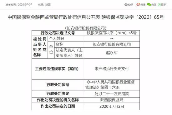 今年7月2日,银保监会网站披露的罚单显示,长安银行未严格执行受托支付收到一张行政罚单。陕西银保监局作出的行政处罚决定是处以21万元罚款。