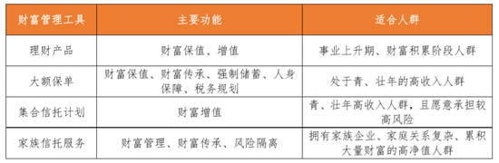随着中国的财富群体日益扩大,高净值人群的财富管理需求、财富传承需求也日益增加,财富管理作为资管新规出台后,各机构未来业务突破的方向,成为各方必争之地,尤其是商业银行私人银行更是大力布局这一前景广阔的领域。常见的财富管理方式包括理财产品、大额保单、集合信托产品、家族信托等,它们适用于不同年龄、不同事业阶段的人群,并且在资金投向、收益分配、风险隔离、家族治理以及财富传承等方面各有优劣。