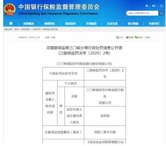 另一则行政处罚信息显示,三门峡湖滨农村商业银行股份有限公司由于贷款三查不尽职,依据《流动资金贷款管理暂行办法》第十三条、第十四条、第三十条,《中国银监会关于完善和创新小微企业贷款服务提高小微企业金融服务水平的通知》第三条,《个人贷款管理暂行办法》第十四条、第二十条、第三十五条,《中华人民共和国银行业监督管理法》第四十六条、第四十八条,三门峡银保监分局于2020年11月23日对该行处以罚款25万元。