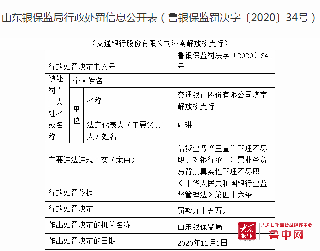 12月7日,中国银行保险监督管理委员会山东监管局发布消息,交通银行股份有限公司济南解放桥支行因信贷业务“三查”管理不尽职、对银行承兑汇票业务贸易背景真实性管理不尽职,根据《中华人民共和国银行业监督管理法》第四十六条,被中国银行保险监督管理委员会山东监管局处以罚款95万元。