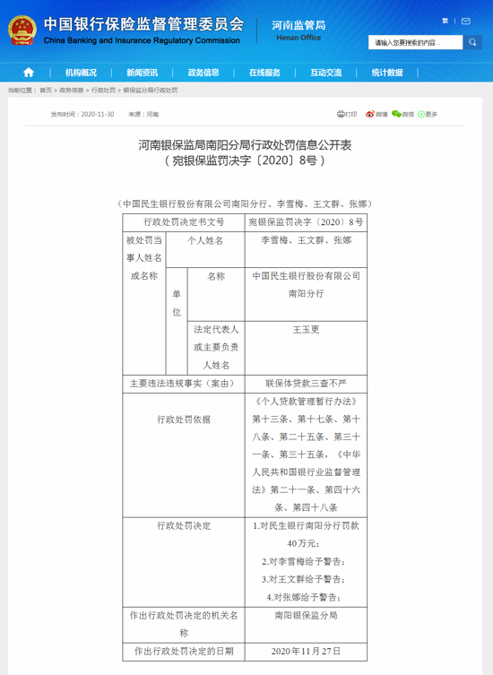 11月30日,中国银行保险监督管理委员会河南银保监局南阳银保监分局发布处罚公告:中国民生银行股份有限公司南阳分行因联保体贷款三查不严被罚款40万元,3名责任人被警告。