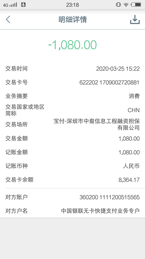 开甲财经注意到,为信用飞、畅行花平台提供扣款的主要支付机构为宝付。例如,聚投诉网友反馈,其3月25日从信用飞平台借款9000元,到账后立即被宝付支付扣款1080元,扣款方为深圳市中裔信息工程融资担保有限公司(简称“中裔担保”)。对此,该网友认为宝付为信用飞提供盗刷服务。