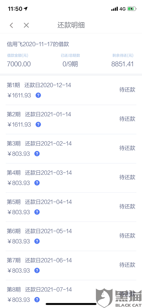 12月13日,网友在黑猫投诉发帖反馈,其在信用飞平台借款7000元,分9期还款,利息超过1800元。根据网友贴出的截图,其在“信用飞”借款7000元,分9期还款,第1-2期每期还款1611.93元,第3-9期每期还款803.93元,以IRR公式计算,该笔贷款实际年化高达70%。