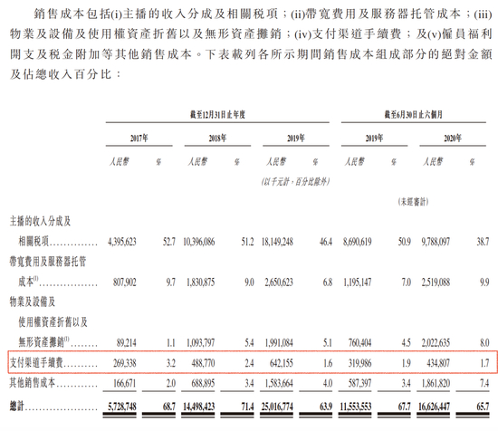 以快手为例,其招股书数据显示,从2017年到2019年,其支付渠道手续费分别为2.69亿、4.89亿和6.42亿元,而在2020年上半年,该笔费用上涨至4.35亿元。尽管其在总体费用中占比不高,但是伴随着业务规模上涨,手续费成本只会日益高涨。