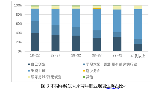 千禧年前后出生的年轻人更喜欢有挑战性的工作与事业。他们父辈所青睐的按部就班、循规蹈矩的“打工仔”生活,很难吸引新一代的年轻人。根据我们的调查,“零零后”中有超过60%的受访者希望在两年内可以自己创业或者去学习本领,进而跳槽到更有前途的行业。随着年龄的增长,继续安安稳稳地守在目前的岗位上的人数的比例越来越大。一方面,随着年龄的增加,他们所需要承担的责任越来越重,不得不去更多地考虑自己的家庭、父母,因而他们相对不愿意去冒险进行创业。而且年龄的增长与琐事的增加,都使得他们的精力变得越来越有限,学习本领并转行,对于他们来说也越来越不现实。