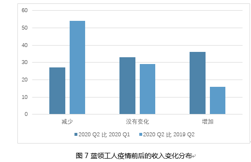 从收入的角度来看,在调研期间,蓝领阶层的平均收入水平并没有完全恢复到往年同期水平,也就是说恢复的状态还不算特别理想。从下图中我们可以看出,在这99位受访者中,虽然相较于疫情期间的第一季度来说,在第二季度的收入预期要明显好于第一季度,其中,表示自己的收入在第二季度中与第一季度相比保持不变或者增加的人超过了2/3。然而,如果将今年其在第二季度的收入与去年第二季度的收入进行比较的话,可以看出,超过一半的人表示他们在第二季度预期的收入要比去年的第二季度有所减少。因而,从收入的角度来讲,我们说蓝领阶层还没有完全从疫情之中恢复出来。