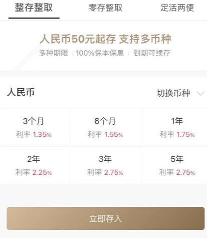 产品介绍显示,该系列产品包括1年、6个月、3个月三种期限,储蓄存款利率分别为5%、3.5%和3.3%,起存金额分别为50000、100和100元。在安全性上,作为存款,保本保收益;流动性上,随时可以取(提前取按活期利率和实际持有天数计算收益);手续上,无需评估可以直接购买。