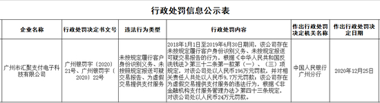 具体来看,2018年1月1日至2019年6月30日期间,广州市汇聚支付电子科技有限公司存在未按规定履行客户身份识别义务、未按规定报送可疑交易报告的行为,根据《中华人民共和国反洗钱法》第三十二条第一款第(一)、(三)项规定,对该公司处以人民币196万元罚款,并对相关责任人共处以人民币9.7万元罚款;该公司存在为虚假交易提供支付服务的违法行为,根据《非金融机构支付服务管理办法》第四十三条规定,对该公司处以人民币24万元罚款。