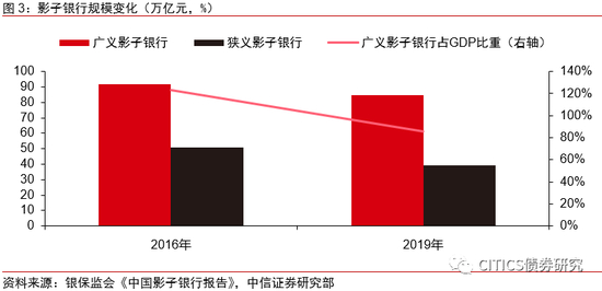 2017年起,我国加大了对影子银行的治理力度。《中国影子银行报告》中披露中国广义影子银行规模从2016年底的91.8万亿元降至2019年末的84.8万亿元,狭义影子银行规模从2016年底的51.01万亿元下降至2019年底的11.87万亿元。广义影子银行占GDP的比重从2016年底的123%降至2019年底的86%。