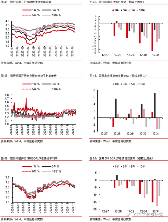 上周利率债收益率全面下行。截至12月31日,国债方面,1年期、3年期、5年期、10年期分别变动-17.62bps、-9.23bps、-9.27bps、-8.74bps。国开债方面,1年期、3年期、5年期、10年期分别变动-18.78bps、-11.43bps、-8.14bps、-9.7bps。