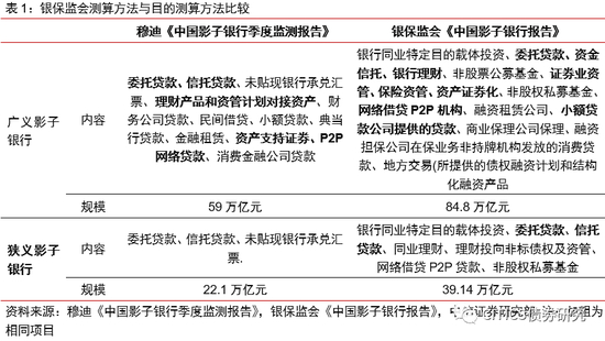 对比银保监会和穆迪发布的中国影子银行测算方法,部分项目有重叠,包括委托贷款、信托贷款、理财产品、资产支持证券、P2P网络贷款等。但对比而言,银保监会的测算方法更符合中国影子银行以银行为中心,表现为“银行的影子”的特征。例如将银行理财纳入狭义影子银行,将银行同业特定目的载体投资纳入广义和狭义影子银行。银保监会将理财投向非标债权及资管纳入狭义影子银行也体现中国影子银行通道业务盛行的特征。银保监会方法更能体现中国影子银行主要的风险项目,例如将P2P网络借贷、理财投向非标债权及资管等项目纳入狭义影子银行。相比之下,银保监会测算方法更接地气。从测算规模上看,由于银保监会涵盖的项目更多,因此对影子银行规模的测算结果也相对更大。相比于2013年的107号文,此次银保监会发布的测算方法更具实际操作性,可更好地测算我国影子银行规模,进而对监测和预防潜在金融风险有重要意义。