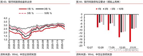 货币市场:银质押呈全面上行,SHIBOR呈大体上行。DR001加权平均利率为1.10%,较上周变动33.94bps;DR007加权平均利率为2.46%,较上周变动30.02bps;DR014加权平均利率为2.93%,较上周变动12.31bps;DR021加权平均利率为3.10%,较上周变动8.11bps;DR1M加权平均利率为3.06%,较上周变动1.09bps。截至1月1日,SHIBOR方面,隔夜、7天、1个月、3个月对比上周分别变动30bps、23bps、0bps、-1bps至1.09%、2.38%、2.70%、2.76%。