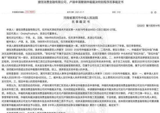 此前,漯河市源汇区劳动人事争议仲裁委员会作出的源劳人仲案字﹝2020﹞0135号仲裁裁决显示,捷信支付卢琪2020年1月至7月的职位补贴4200元,未休年休假工资1173.3元,共计5373.3元整。