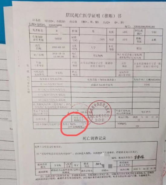 “我们刚好符合前三条理赔标准”,刘文妈妈告诉财经网,她看学校当时的录像,注意到刘文倒地前,曾突然捂着胸口表情痛苦。医院给出的居民死亡医学证明(推断)书也显示,刘文接诊时已查无生命体征,经抢救无效宣告死亡。根本死亡原因是“急性心肌梗死” ,生前主要疾病最高诊断依据为死后推断,而死后推断结果为,急性心肌梗死。