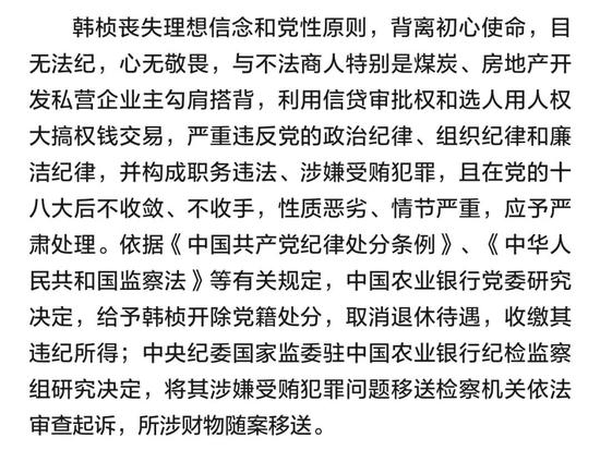 中央纪委国家监委驻中国农业银行纪检监察组对韩桢的通报,全文近600字。